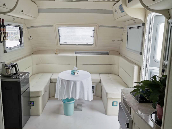 新馬蓋虎公路營地兩用豪華型拖掛房車內(nèi)飾及布局:大一居的車內(nèi)整體布局讓車內(nèi)寬敞明亮,會客區(qū)、廚房區(qū)、吧臺區(qū)、洗浴區(qū)、臥室區(qū)功能分明,內(nèi)裝分天青色、卡其色、白色,并可為用戶提供更多選擇。值得一提的是環(huán)形沙發(fā)、中部吧臺、尾部雙縱向單人床與國內(nèi)局促的C型車比較更具實(shí)用性。